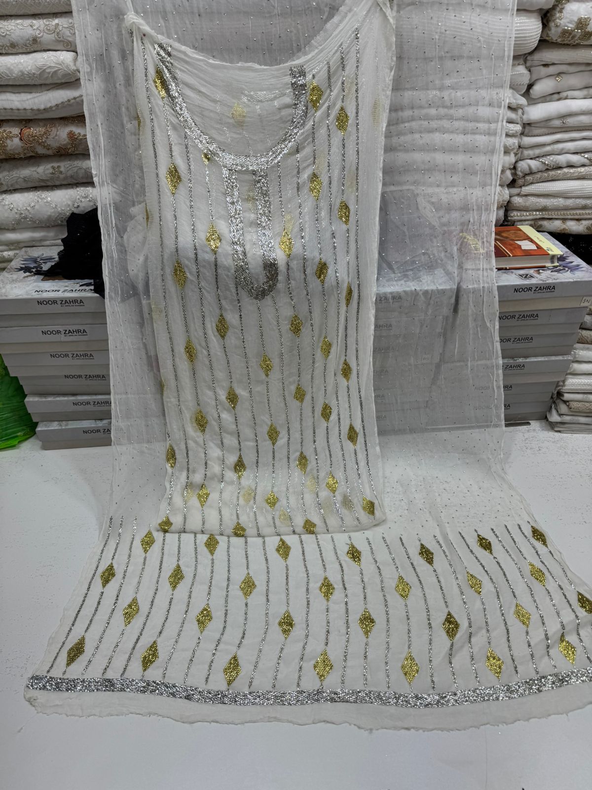 At Aljannat Fabrics, we specialize in timeless elegance crafted with passion. Our exclusive collection features the finest pure, dyeable fabrics and exquisite handmade Mukesh work on premium Indian Gaji Silk dupattas and dresses. Each piece reflects a perfect blend of heritage craftsmanship and modern style, designed to bring luxury and grace to your wardrobe.